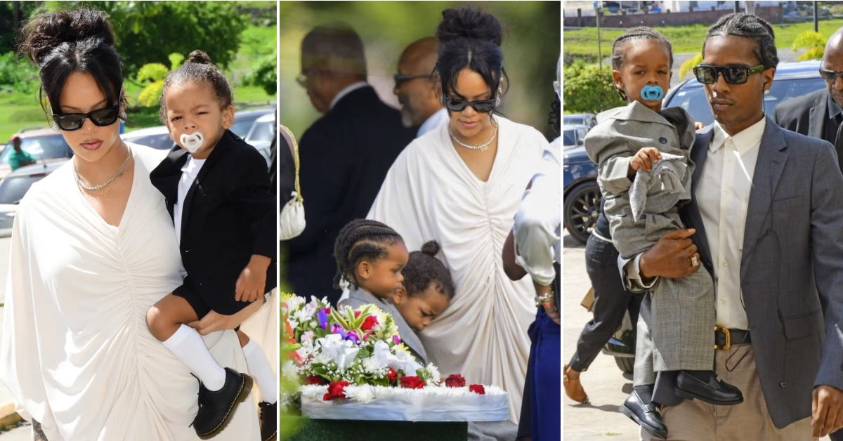 Бремената Ријана во долг фустан со двете деца и саканиот Ејсап Роки на погребот на татко ѝ кој почина во мај