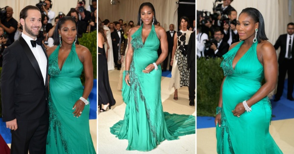 Серена Вилијамс пред две недели ненамерно ја откри својата бременост, преку објава на Snapchat. Успешната тенисерка сега го истакна трудничкото стомаче во смарагдно-зелен фустан на балот МЕТ, каде беше придружувана од својот вереник.