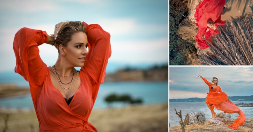 Бремената Тамара Тодевска во црвен лелеав фустан во спотот за „Довидување таго“ снимен во Грција