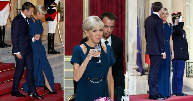 За свеченоста која се одржа во Елисејската палата во Париз, 65-годишната прва дама на Франција избра долг син фустан од нејзиниот омилен бренд Луј Витон.