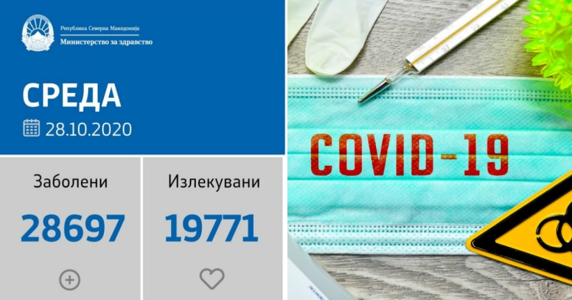 Вкупната бројка на ковид дијагностицирани во нашата земја од почетокот на епидемијата изнесува 28.697, бројката на оздравени пациенти е 19.771, на починати е 963, а бројот на активни случаи изнесува 7.963.