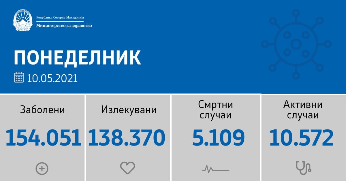 Вкупната бројка на Ковид-дијагностицирани лица во нашата земја од почетокот на епидемијата изнесува 154.051, бројката на оздравени пациенти е 138.370, на починати е 5.109, а бројот на активни случаи изнесува 10.572.