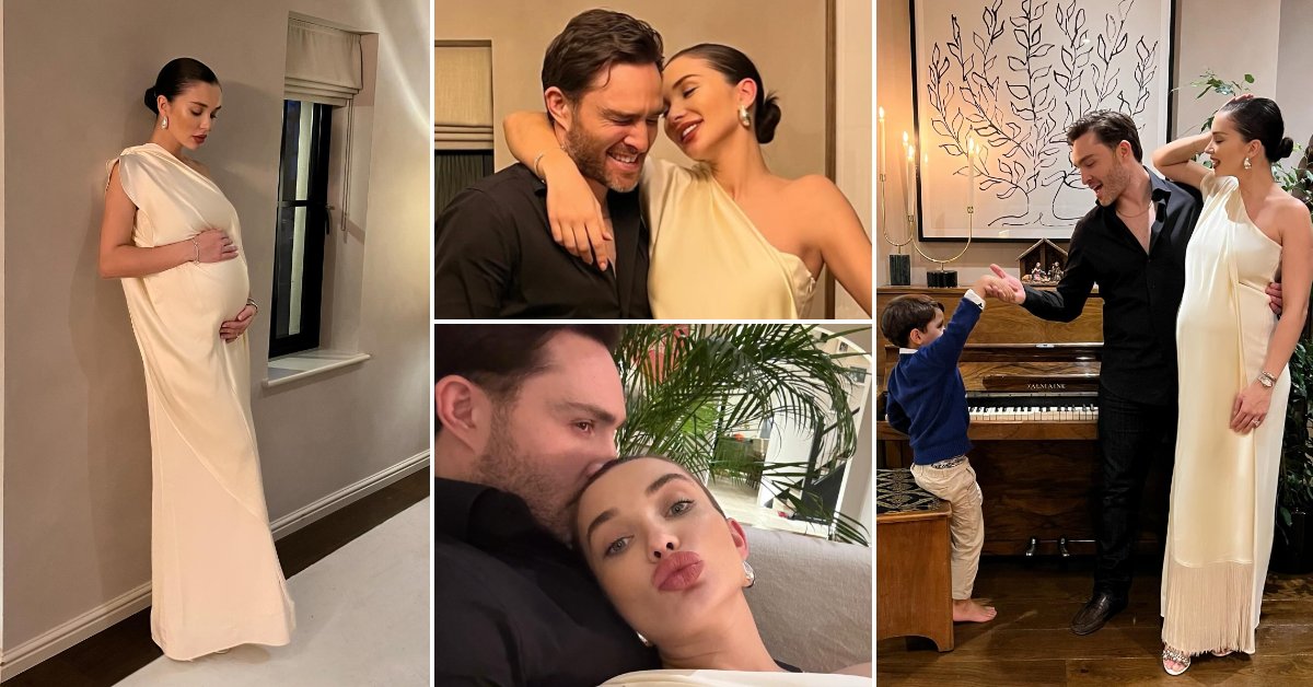 Згодниот шармер од серијата „Gossip Girl“ и убавата актерка споделија фотографии од празничната атмосфера во нивниот дом. Ејми го истакна големото трудничко стомаче во бел свилен фустан. На дел од фотографиите е и нејзиниот син Андреас кој го има со претходниот вереник.