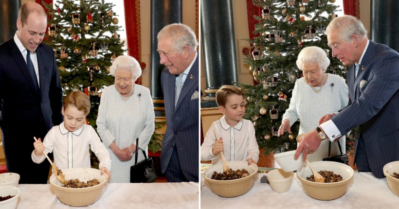 На нив, малиот принц Џорџ приготвува божиќен пудинг заедно со неговиот татко Вилијам, дедо му Чарлс и неговата прабаба – кралицата Елизабета II.