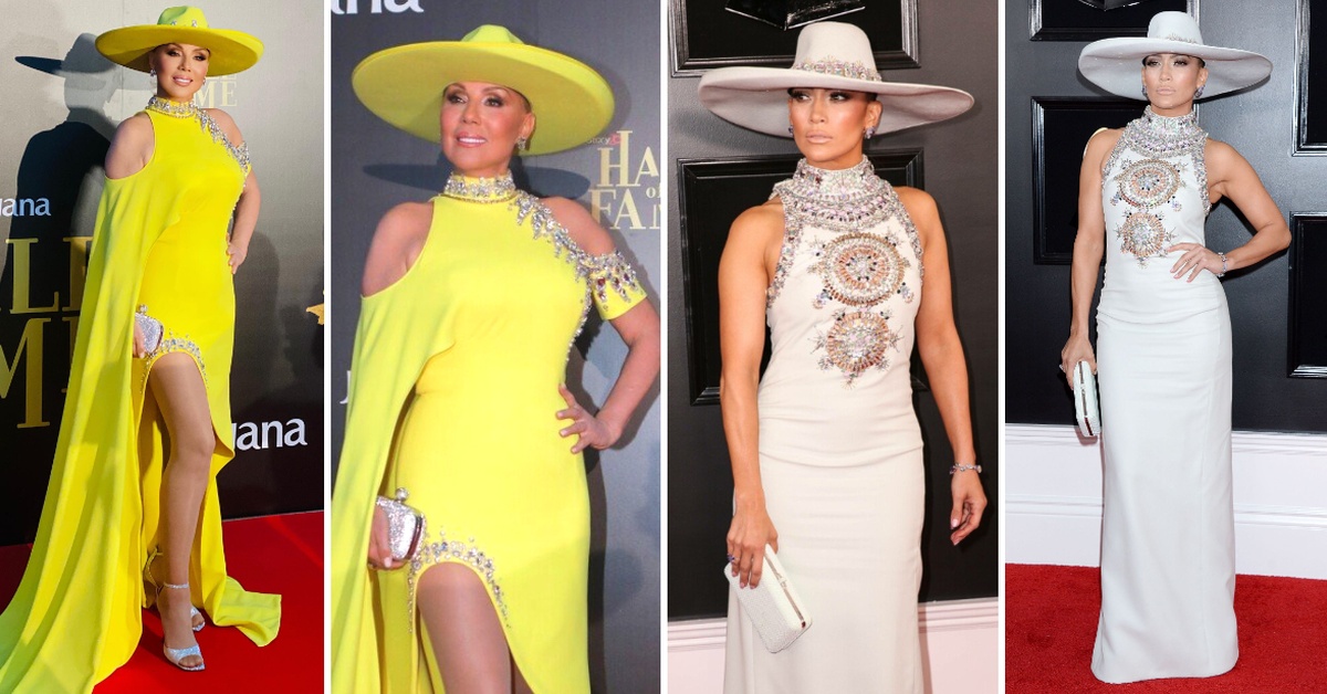 61-годишната балканска ѕвезда носеше фустан со шлиц и голем шешир, а во слична модна комбинација се појави Џеј Ло на Греми во 2019 година.