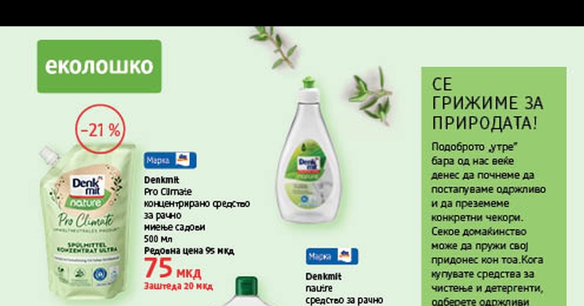 Прашањето КАКО да живеете одговорно, веќе нема да биде предизвик – доволно е да решите да ја подарите вашата доверба на еколошки алтернативните производи, во замена на конвенционалните кои секојдневно ги употребувате. Во сите 20 дрогерии во нашата земја ве очекува ЕКО програмата за одржување на домаќинството, која на вашиот дом ќе му ја пружи потребната свежина, а вас ќе ве направи вистински сојузник на природата