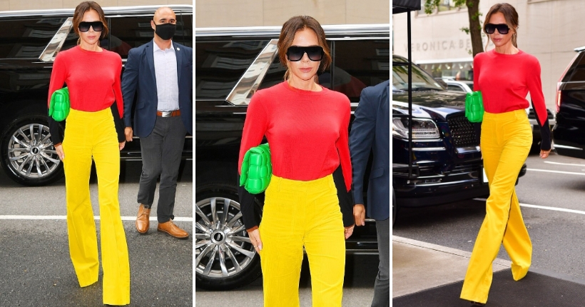 47-годишната дизајнерка беше затекната пред студиото на „Good Morning America“ во колоритна комбинација, која обединуваше црвена блуза и жолти панталони со нејзин потпис и зелена чанта од Ботега Венета.