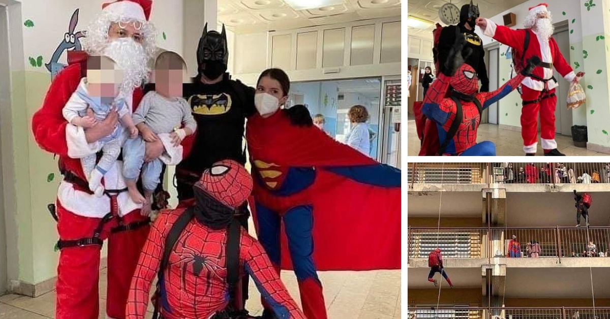 Суперхероите Спајдермен, Бетмен и Супермен, потпомогнати од Дедо Мраз, се спуштија со јажиња за да ги израдуваат малите пациенти и да им подарат новогодишни пакетчиња.