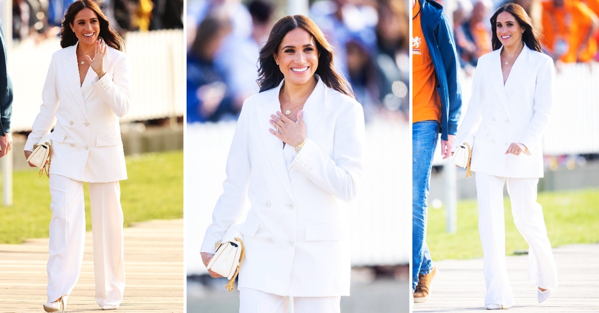 На овој настан, Меган шармираше во комплетно бел стајлинг. Таа носеше елегантен костум и чантичка од модната куќа Валентино.