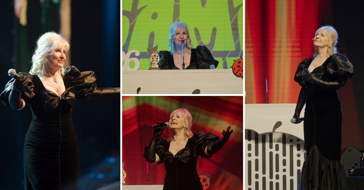 Талентираната пејачка самоуверено зачекори на сцената во црн стајлинг и докажа дека умее да плени со елеганција и во осмата деценија од животот. Темниот фустан со волуменозни ракави и панделка на деколтето таа го надополни со високи ракавици и блескав накит.