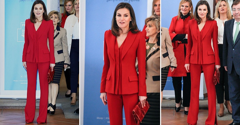 46-годишната припадничка на шпанското кралско семејство се истакна во деловно издание во културниот комплекс „Сан Франциско“ во Касерес, Шпанија. Еднобојниот стајлинг вклучуваше црвен костум од Роберто Торета и обувки од Варела.