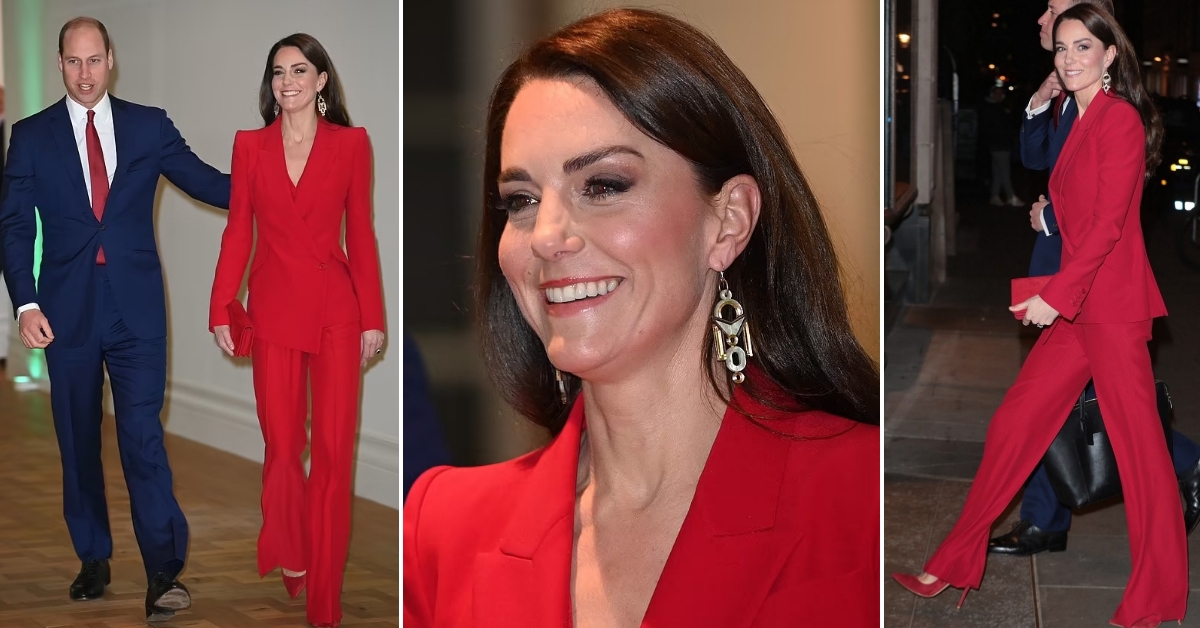 41-годишната припадничка на британското кралско семејство шармираше во црвен костум од Александар Меквин, кој го искомбинира со салонки од Џанвито Роси и чантичка од брендот Miu Miu. Кетрин беше придружувана од принцот Вилијам.