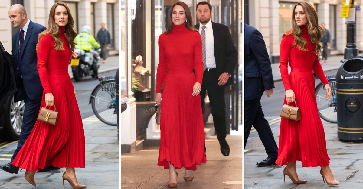 За оваа пригода, 39-годишната припадничка на британското кралско семејство избра модерен црвен стајлинг, кој вклучуваше плисирано здолниште.
