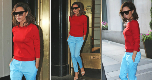 Плакарот на Викторија Бекам претежно содржи облека во неутрални нијанси, а доминира црната боја. Но, вчера 42-годишната дизајнерка ги изненади своите фанови откако го напушти својот хотел во Њујорк во комбинација од силни бои.