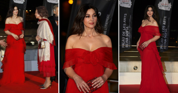 За свечениот настан, 52-годишната актерка избра елегантна долга креација од модниот дизајнер Валентино Гаравани, кој беше и нејзин придружник таа вечер. Белучи се сретна и со шпанската кралица Софија, која исто така беше облечена во црвен фустан. Двете дами се поздравија со насмевка.