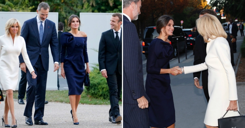Летиција носеше тегет фустан од Delopozo додека првата дама на Франција за средбата избра минималистичка бела креација.
