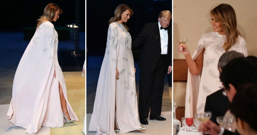 Меланија Трамп е стилски безгрешна за време на официјалната посета на Јапонија со Доналд. Откако пристигна во земјата во фустан од Келвин Клајн и шармираше во елегантен фустан од Каролина Ерера, за свечен банкет во Токио, таа избра долга креација со наметка.