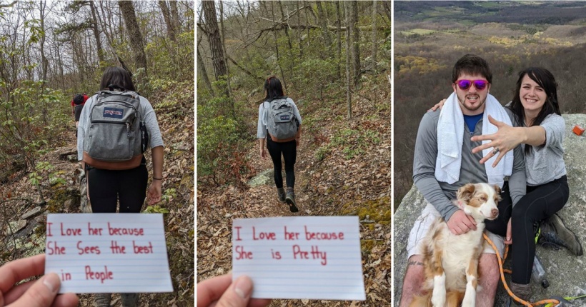 Креативниот дечко од Северна Каролина организираше планинарење, бидејќи тоа ѝ било омилена активност на Кајла, и по патот скришно ја фотографираше заедно со пораки во кои опишува зошто ја сака.