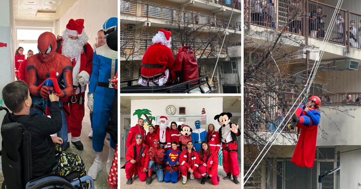 „Да подариме насмевка. Волонтерите на Тимот за одговор при катастрофи – Тим за спасување на планина, облечени во костимите на детските херои, Спајдермен, Бетмен, Мини Маус и Супермен, а потпомогнати од Дедо Мраз, со јажиња се спуштија на Клиниката за детски болести во Скопје. На малите пациенти им подарија насмевки и новогодишни пакетчиња за претстојните празници“ – стои во описот на фотографиите споделени од Црвениот крст на Facebook.