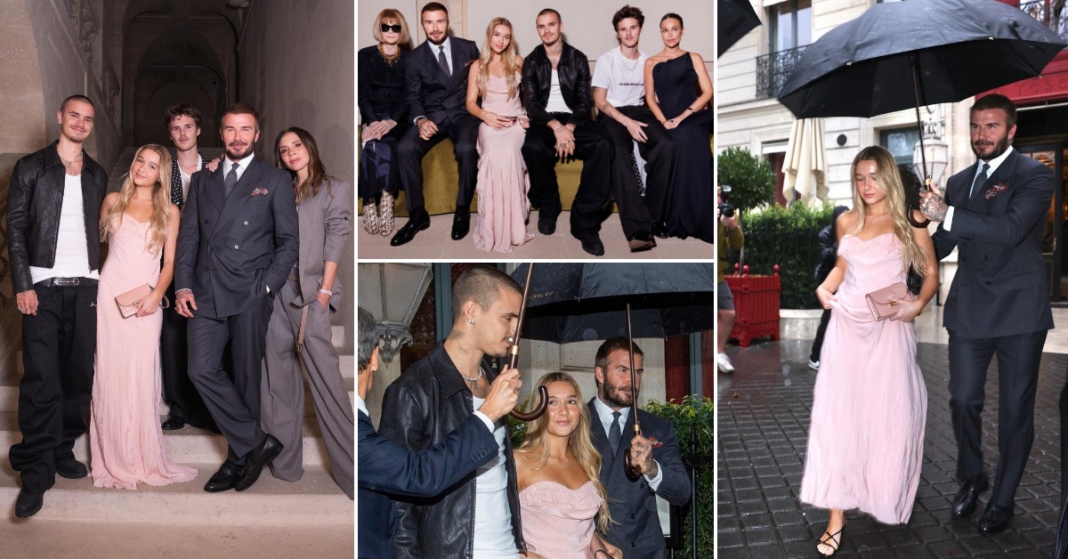Дејвид Бекам со децата во првиот ред на ревијата на Викторија во Париз, пораснатата Харпер елегантна во долг фустан