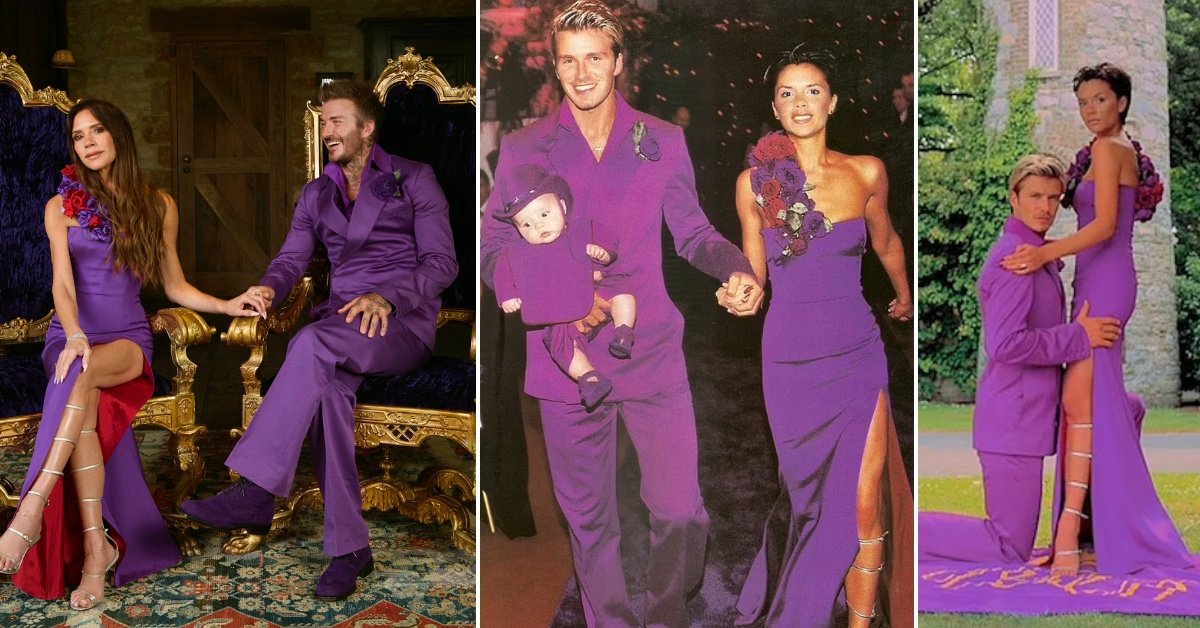50-годишната дизајнерка го носеше фустанот од Антонио Берарди во кој му го кажа судбоносното „Да“ на 49-годишниот фудбалер во 1999 година. Дејвид го носеше познатиот виолетов костум и обувките во складна боја.