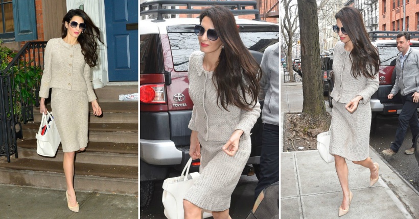 Реномираната адвокатка носеше женски деловен костум од твид кој е дело на модната куќа Шанел. Својот стилски избор, Амал го надополни со обувки од Џими Чу и чанта од Роџер Вивиер.