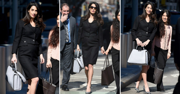 Бремената адвокатка, која е во брак со актерот Џорџ Клуни, одржа говор во седиштето на Обединетите Нации во Њујорк на Меѓународниот ден на жената. 39-годишната Британка со либанско потекло носеше црн женски костум и салонки од Салваторе Ферагамо.