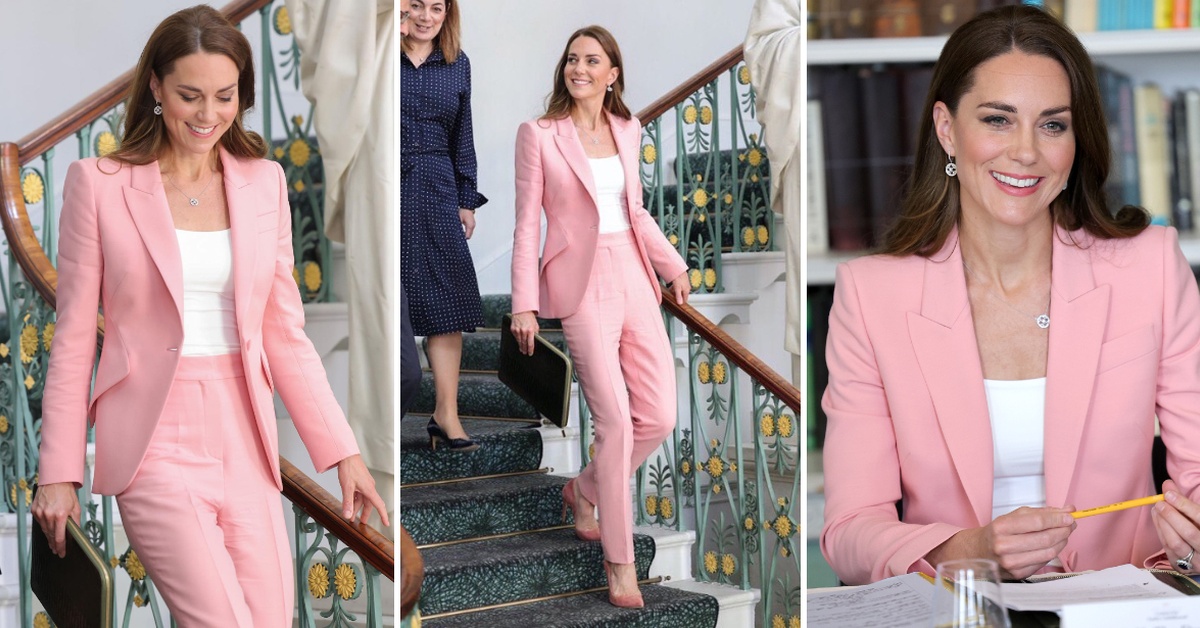 На средбата во Лондон, 40-годишната сопруга на принцот Вилијам се појави во деловен стајлинг, кој вклучуваше розов костум од Александар Меквин.