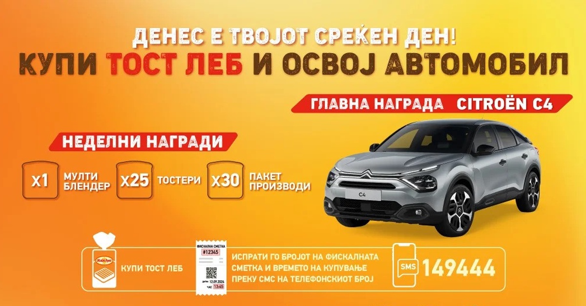 Купи 1 тост леб по твој избор, испрати го бројот на фискалната сметка** и времето на купувањето преку СМС* на телефонски број 149 444 и учествувај во ГОЛЕМАТА НАГРАДНА ИГРА.