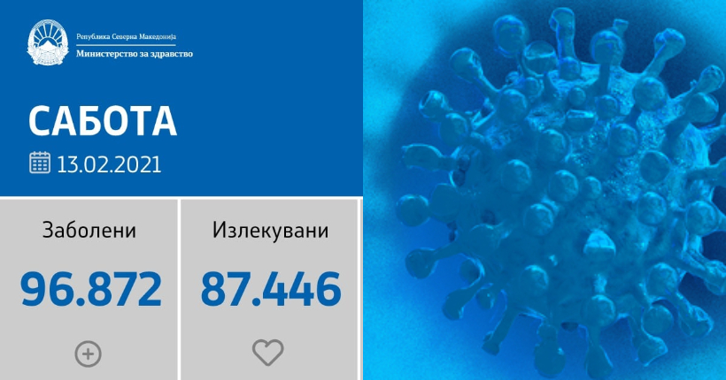 Вкупната бројка на КОВИД-дијагностицирани лица во нашата земја од почетокот на епидемијата изнесува 96.872, бројката на оздравени пациенти е 87.446, на починати е 2.976, а бројот на активни случаи изнесува 6.450.