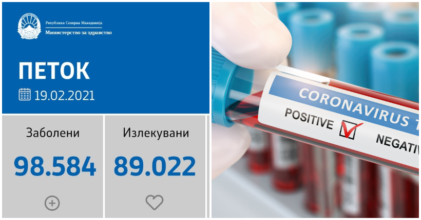 Вкупната бројка на КОВИД-дијагностицирани лица во нашата земја од почетокот на епидемијата изнесува 98.584, бројката на оздравени пациенти е 89.022, на починати е 3.037, а бројот на активни случаи изнесува 6.525.