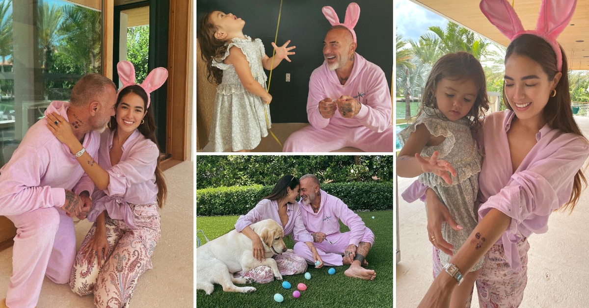 Џанлука и 28-годишната Венецуелка позираат облечени во розово, а ќеркичката Блу Џерусалема ги собира „скриените“ велигденски јајца низ градината.