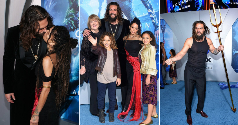 Џејсон Момоа со Лиса Бонет и двете деца на синиот тепих на „Aquaman“ пред да заигра хака танц