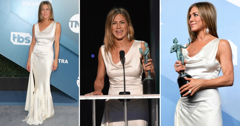 Вообичаено, актерките на црвениот тепих носат позајмени дизајнерски креации, но Анистон овој пат се одлучи за свилен бел фустан кој веќе го поседувала. Станува збор за долг бел фустан дизајниран од Џон Галијано за Кристијан Диор.