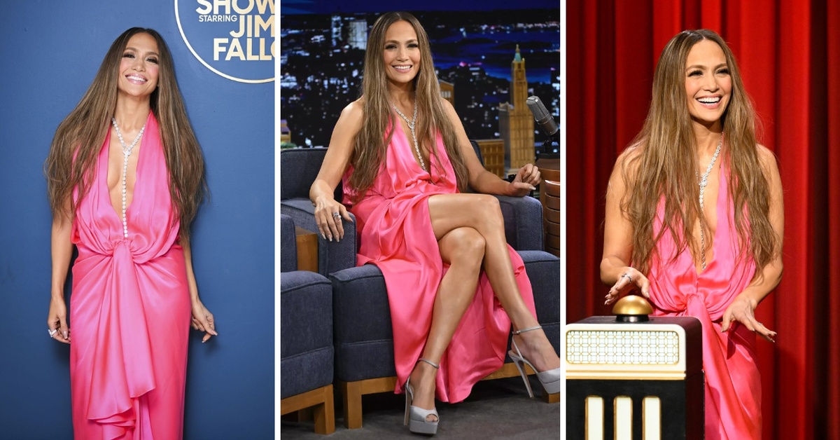 Во шоуто на Џими Фелон, музичката дива изгледаше фантастично во циклама фустан со многу длабоко деколте. Својот моден избор, Лопез го зачини со блескав накит и сандали на ултра високи потпетици.