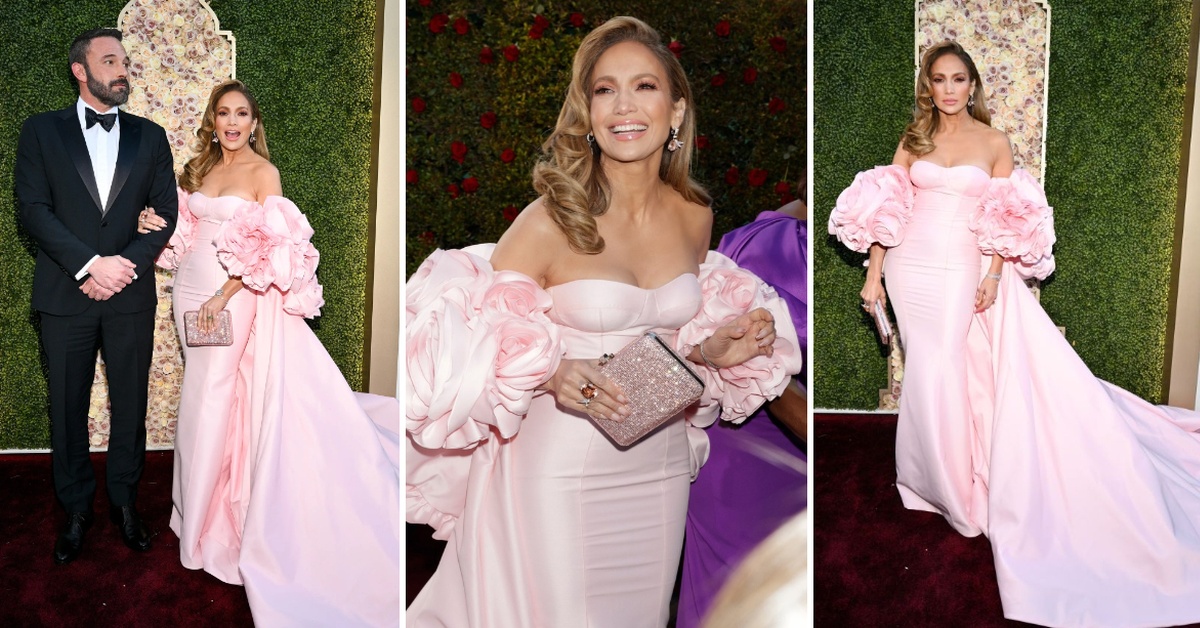 Атрактивната ѕвезда зачекори на свеченоста во Беверли Хилс, блескајќи во романтична розова креација со волуменозна цветна наметка. Фустанот е дело на модната куќа Nicole + Felicia, а одлично ги оцрта облините на Лопез.