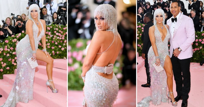 На свеченоста, 49-годишната ѕвезда ги истакна своите препознатливи облини во атрактивна креација од Версаче. На главата, Џеј Ло носеше необична „перика“ со кристали, а беше придружувана од вереникот Алекс Родригез.