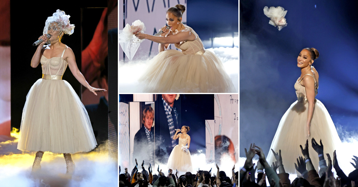 52-годишната актерка и пејачка ја изведе песната „On My Way“ од новиот филм „Marry Me“. Додека настапуваше, таа се скри зад ѕид поставен на сцената и брзо го промени својот аутфит, појавувајќи се како невеста. Креацијата е дело на Долче и Габана.