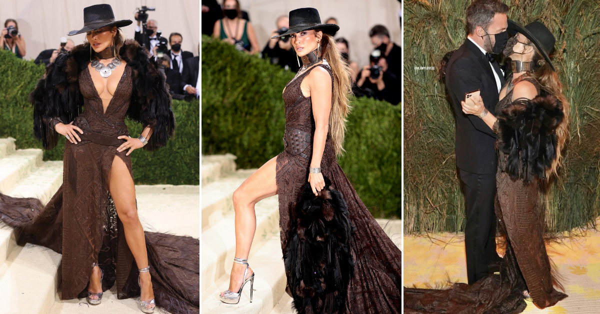 52-годишната модна икона шармираше пред музејот на уметноста „Метрополитен“ облечена во долг вестерн фустан со длабоко деколте и наметка од вештачко крзно од Ралф Лорен. Винтиџ модните додатоци, кои го комплетираа изгледот на Лопез, исто така се од архивата на американската модна куќа.