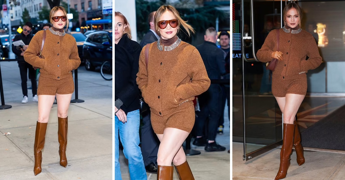 Славната актерка и пејачка за оваа пригода избра плетена комбинација од Гучи во „чоколадна“ нијанса, која е голем актуелен тренд.