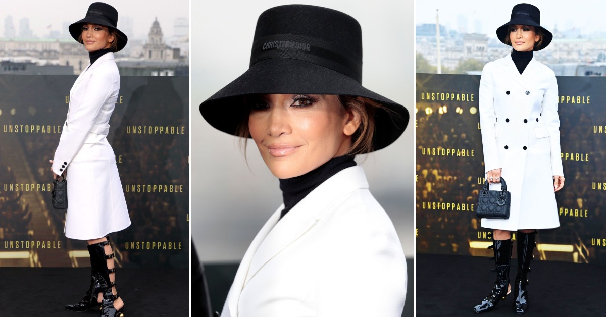 Лопез носеше црн фустан со ролка, бело палто, шешир и гладијаторски обувки кои чинат 2,5 илјади долари.