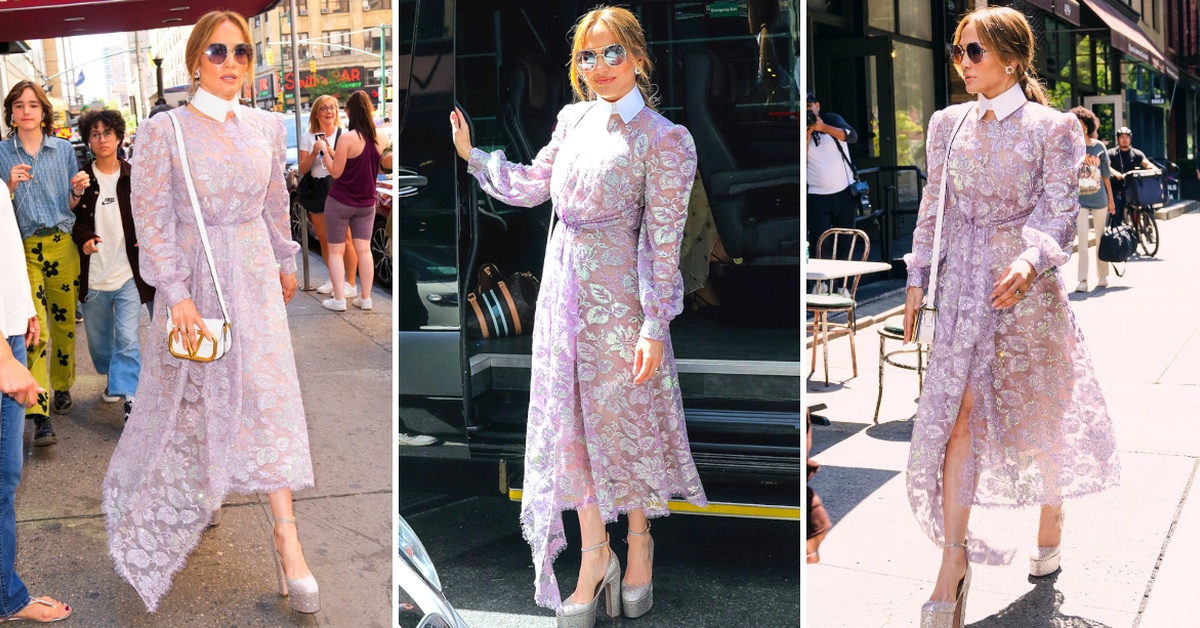 Музичката ѕвезда изгледаше шик во фустан во лаванда нијанса, кој го надополни со чантичка од Валентино и блескави обувки.