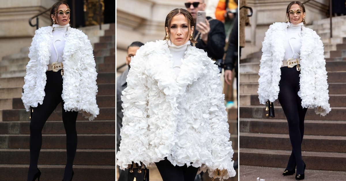 Под палтото, Џеј Ло носеше модна комбинација од црни хеланки со висок струк и бела ролка. Својот изглед, таа го надополни со невообичаени златни очила.