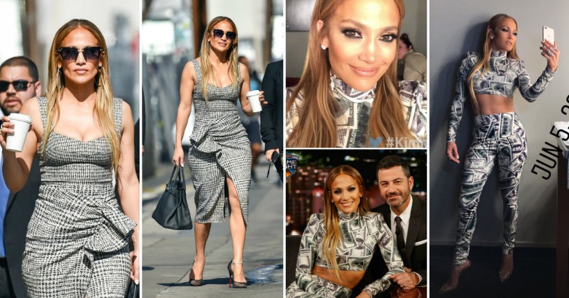 Џенифер Лопез во твид креации пред да се појави во шоуто на Џими Кимел во аутфит со банкноти