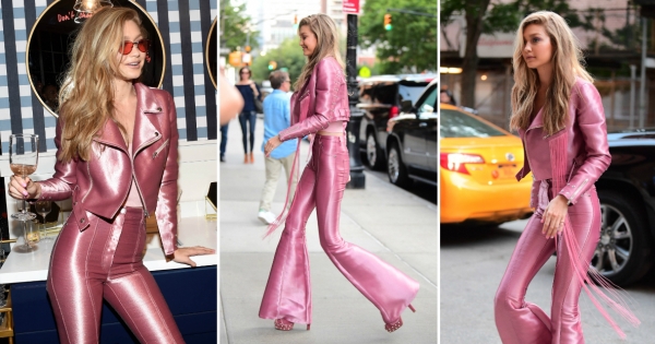 На свеченоста по повод лансирањето на колекцијата, Џиџи носеше розов аутфит од брендот Kreist.