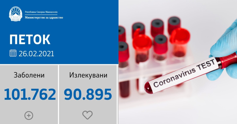 Вкупната бројка на КОВИД-дијагностицирани лица во нашата земја од почетокот на епидемијата изнесува 101.762, бројката на оздравени пациенти е 90.895, на починати е 3.119, а бројот на активни случаи изнесува 7.748.