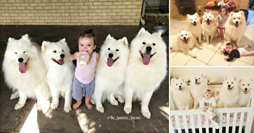 На Instagram профилот „The Samoyed Siblings“, Сара Хегарти покажува како изгледа растењето на нејзините девојчиња покрај четири крзнени миленици. Една од ќерките на Сара дури научи да оди држејќи се за кучињата. „Лејла научи да оди нежно држејќи се за крзното на кучињата и одејќи по нив насекаде низ куќата. Со прикрадување им носи храна, спијат заедно, читаат заедно, прават заедно речиси сè“ – вели фризерката за кучиња.