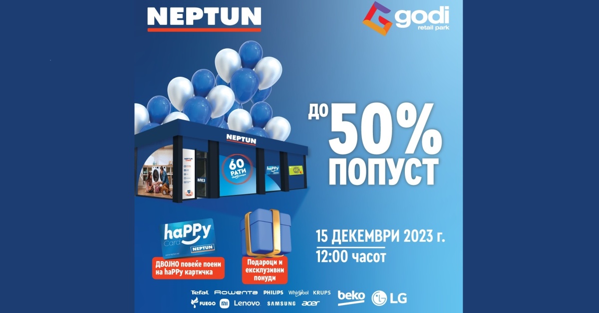 Нептун Македонија ги отвора вратите на новата продавница во петок, на 15.12 во 12.00 часот, на нова и достапна локација, во Ритејл парк Годи, на ул. „Перо Наков“, бр. 108, во нов, уникатен простор.