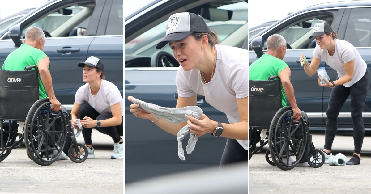Добрината на дело: Џенифер Гарнер му облече чорапи и му ги понуди патиките на бездомник во количка