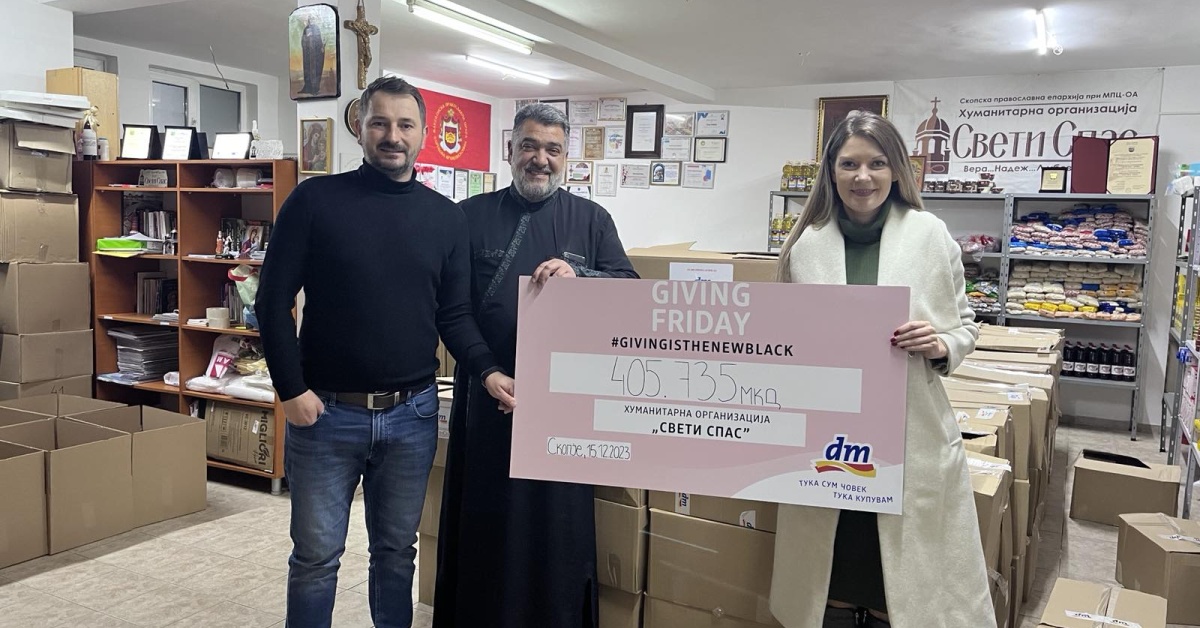Општествено-одговорната компанија dm, под слоганот „Giving is the nеw black“ оваа активност ја спроведува петта година по ред во нашата земја, при која секој Black Friday, наместо попусти, компанијата им нуди можност на своите купувачи да се вклучат во една филантропска активност, во која компанијата донира 5% од вкупниот промет од сите dm дрогерии остварен на овој ден во хуманитарни цели. Активноста „Giving Friday“ како што популарно ја нарекуваат во компанијата, започна во 2019 година со донација кон Клиничкиот Центар во Штип, а минатата година беа донирани 474.000,00 денари во ЈЗУ Универзитетска клиника за ендокринологија.